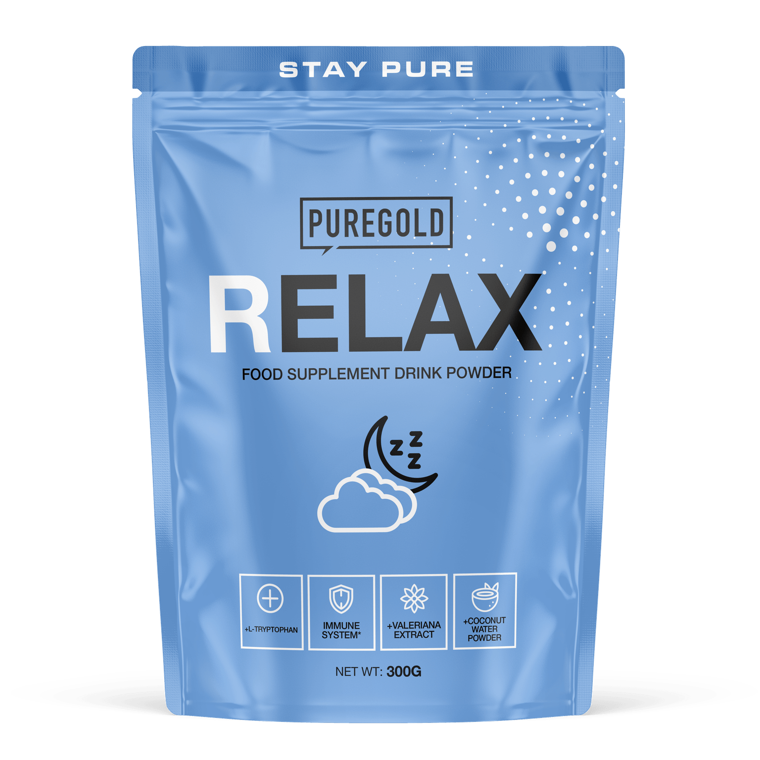 RelaxPure Gold Relax ochucený nápojový prášek jako doplněk stravy s přidaným hydrolyzovaným hovězím kolagenem, inulinem, tryptofanem, práškem z kokosové vody, hořčíkem, rostlinnými extrakty, vitaminem D a sladidly.